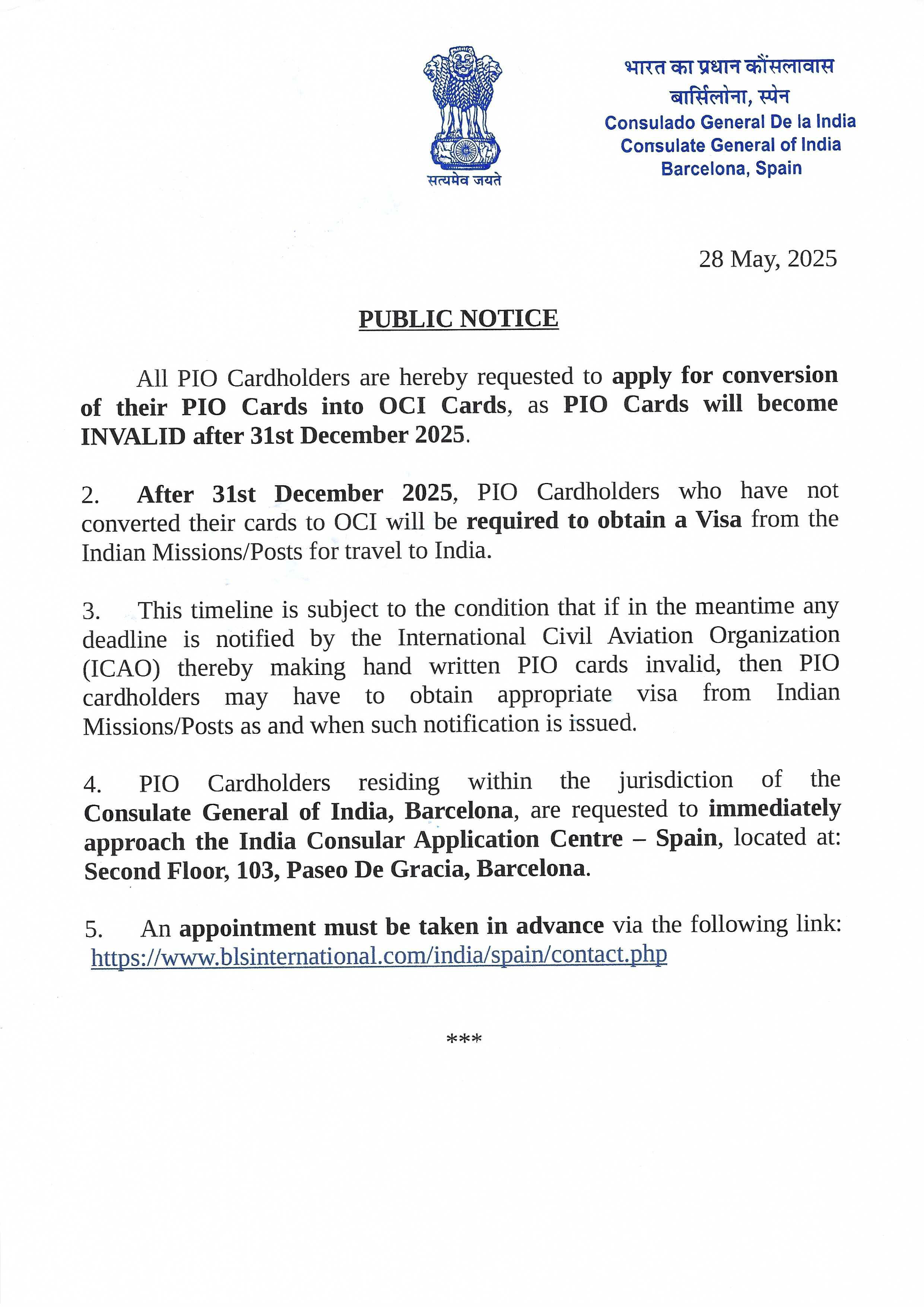 The international Civil Aviation Organization has decided to accept only Machine Readable Travel Documents from October 2018 onwards. This Mission would like to inform that it will be necessary for all existing PIO Card Holders to obtain Machine Readable OCI Cards, in lieu of existing handwritten PIO Cards till 31 March 2020, to avoid any inconvenience.